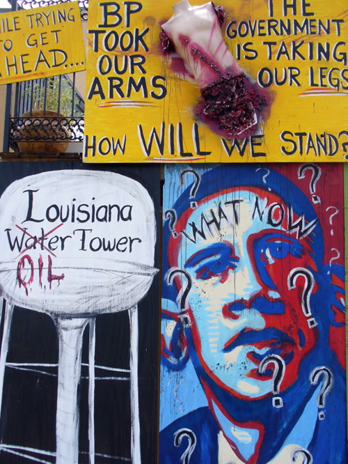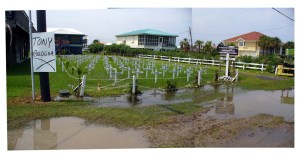 Located on the main drag of Grand Isle, one resident vented frustration at BP by creating a graveyard outside their house to depict each of the things lost from the region as a result of the oil spill.