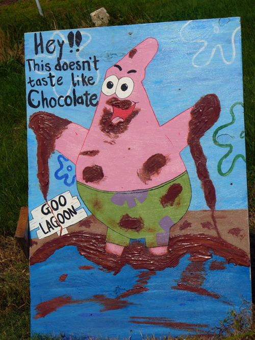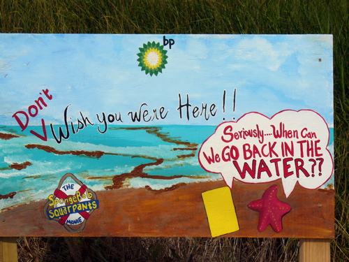 SpongeBob’s humorous sidekick, Patrick the starfish, mistakes BP’s oil for chocolate. This is one of a series of signs posted along the main drag coming into Grand Isle featuring the crew from Bikini Bottom.