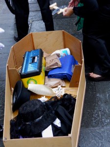 The driver of the hearse hopped down, and Katrina’s pollbearers joined him in a gothic display worthy of any Anne Rice vampire novel. They extracted the faux-coffin of our nemesis and placed it onto the ground. Contained inside was an eclectic mix of memorabilia from the days of Katrina, including bleach (from cleaning out nasty refrigerators), a tarp (to cover those holes in your roof), and MREs (Meals, Ready to Eat, that many subsisted on for months), along with a BP tool box foreshadowing the current oil spill disaster in the Gulf of Mexico.