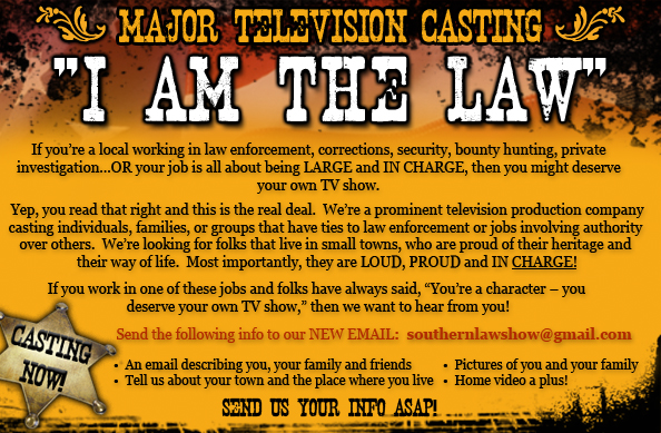 The show, entitled “I Am The Law,” as explained to me, would be based upon an individual or group, who resides in a small southern town and works in the law enforcement field.