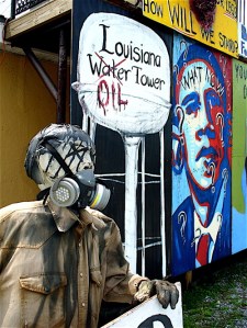 A mock-fisherman soaked in oil, wearing a gas mask to ward off fumes from the polluted fishing waters of Louisiana, is part of the display outside Southern Sting Tattoo.