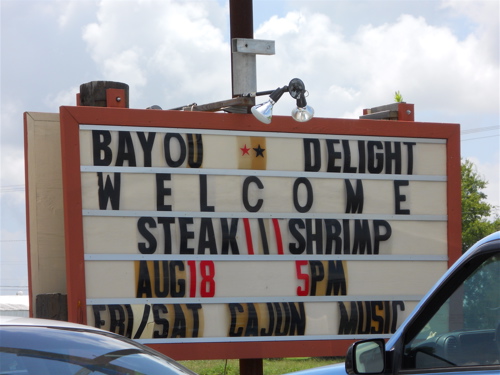 On our travels we passed a Cajun roadside restaurant called Bayou Delight, http://www.houma.com/rest/bayoudelight, I asked Black about it and he said that’s the best around — and he was right. This is some of the finest food I’ve ever had the pleasure to eat. It’s nothing but comfortable inside, ESPN was on and a bunch of locals were hanging around talking, but English was the second language. Everyone was speaking Cajun French. It was awesome!