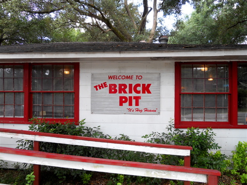 Evidence of the good-natured rivalry between The Brick Pit and its more corporate expansive BBQ brethren from outside Mobile, perched noticeably on the ramp leading up to the main entrance.