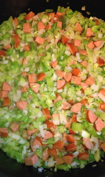 The “Holy Trinity” of green peppers, onions and celery sautéing with the butter and Andouille sausage.