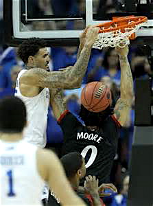 Normally Kentucky would make you pay for playing that zone, but its shots were not falling. Cincinnati lived up to its team’s thug past, from the days when current West Virginia coach Bob Huggins walked their sidelines, and instigated contact to remain competitive with Kentucky for most of the first half in a low scoring affair.
