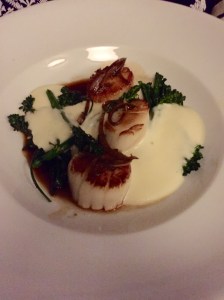 Normally I wouldn’t consider ordering critter at a seafood restaurant. Often any meat on a seafood menu is placed there as an afterthought to appease the few that can’t figure out fish, but the restaurant review pointed out that was not the case at Noble Fin. One of the Friday night specials was a 22 oz. Cowboy Ribeye. I asked our server of its deliciousness level and she assured me of its spectacularity, so I gave it a run. Maia opted for one of their signature dishes, the Seared Diver Scallops.