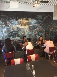Once consumed we scooted back to the Atlanta Breakfast Club to find our table ready. This Southern style kitchen was a vibrant eatery, full of all varieties of nationalities and races, local and otherwise. One whole wall was a floor-to-ceiling chalk board, where diners could etch greetings or draw creatures. The exposed kitchen added to the exciting feel of the restaurant as chefs and waitstaff worked feverishly through the haze of orders.