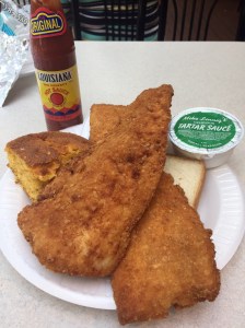 The menu was simple and one page. The standard fish sandwich is two giant planks of fish, two squares of white bread, a side, and a piece of Jalapeño Corn Bread for like $10. It’s a whole bunch of food. Do not miss out on the Jalapeño Corn Bread. That stuff will change your life.
