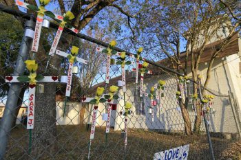 A makeshift memorial on the fencing beside the First Baptist Church.