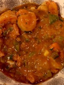 Baby it is cold outside. I’m ready to get in the house where it’s warm, pour a glass of wine and get my cook on. This is the perfect time of year for a hot and spicy dish. I picked up a couple pounds of large shrimp recently that was in need of a purpose. With andouille sausage already on hand and shrimp stock hanging out in my freezer, it was like a tractor beam pulling these three ingredients together. But what to make with them?